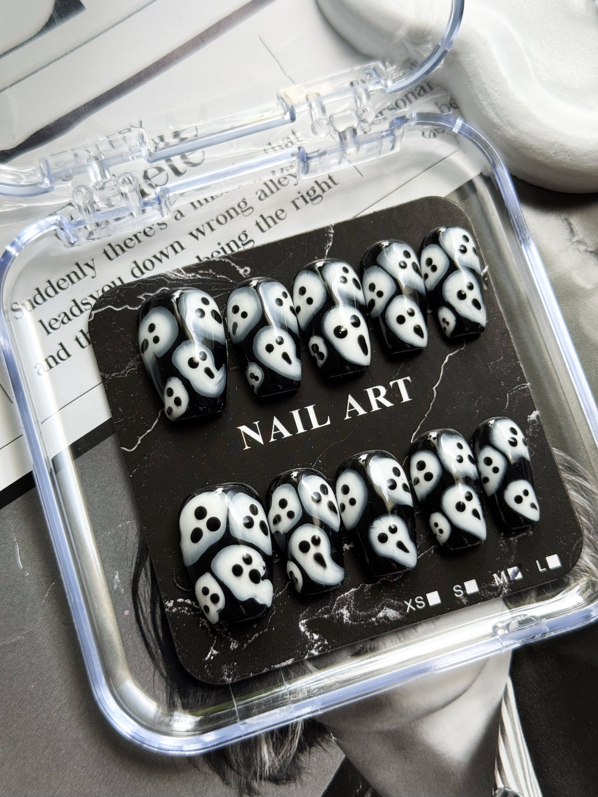 Questo set esclusivo presenta unghie a ballerina corta con base nera intensa su cui danzano simpatici fantasmini bianchi dall'aria birichina. Ogni unghia racconta una piccola storia spettrale con nail art realizzata a mano che trasforma le tue dita in una festa di Halloween indimenticabile. Il contrasto bianco su nero crea un effetto drammatico ma giocoso, perfetto per chi vuole osare senza perdere il fascino